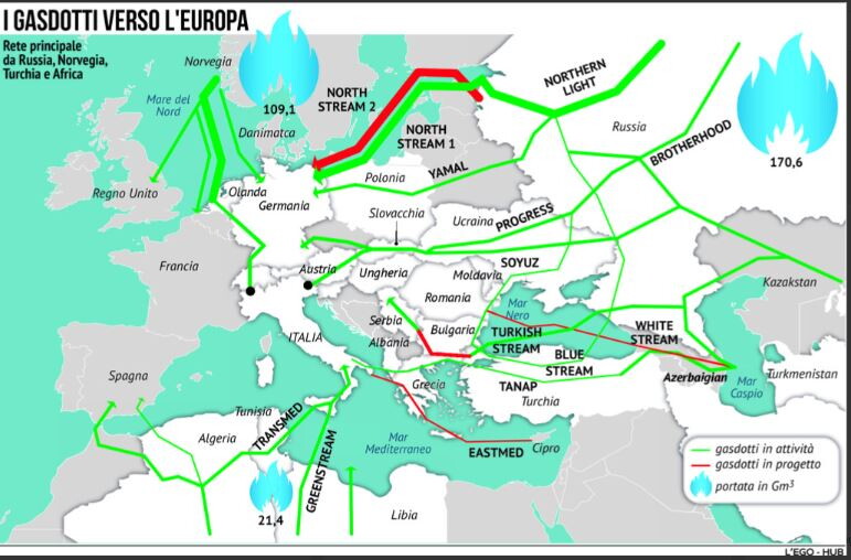 E mentre da Strasburgo anche il ministro degli esteri Luigi Di Maio assicura che «ad oggi tutte le forniture di gas dalla Russia all’Italia continuano ad andare avanti regolarmente», le notizie che arrivano dall’Europa ripropongono il problema dell’autosufficienza energetica, come ribadito anche dal presidente del Copasir Adolfo Urso. Con riferimento al «gas quale energia ponte nel processo di transizione ecologica ed alla realizzazione di determinate infrastrutture per le quali imprescindibile è uno snellimento delle procedure autorizzative - afferma Urso - l’Italia può «candidarsi al ruolo protagonista di hub mediterraneo e quindi europeo con l’obiettivo di raggiungere l’autonomia energetica. Questo però - aggiunge - presuppone un differente approccio geopolitico dell’Italia ed una politica estera che garantisca quel rapido affrancamento dal gas russo assicurando così la continuità degli approvvigionamenti».