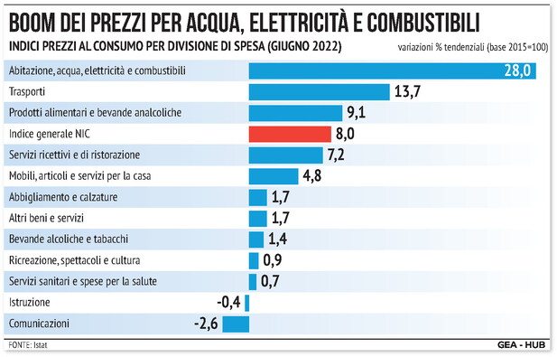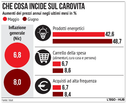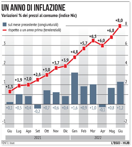 Dalla frutta ai voli, dalle bollette al tempo libero. L’inflazione a giugno dilaga e tocca l’8%, il tasso più alto da 36 anni. Per il «carrello della spesa» con i beni alimentari, per la cura della casa e della persona il rincaro è ancora maggiore e raggiunge l’8,3%, nei dati preliminari dell’Istat. Anche questo è un valore record da gennaio del 1986.