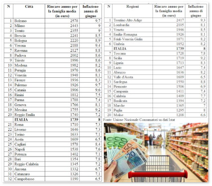 In testa alla classifica delle regioni più "costose" con un'inflazione annua a +9,3%, il Trentino che registra a famiglia un aggravio medio pari a 2417 euro su base annua. Segue la Lombardia, dove la crescita dei prezzi dell'8,1% implica un'impennata del costo della vita pari a 2105 euro, terza il Veneto, +8,5%, con un rincaro annuo di 1946 euro.