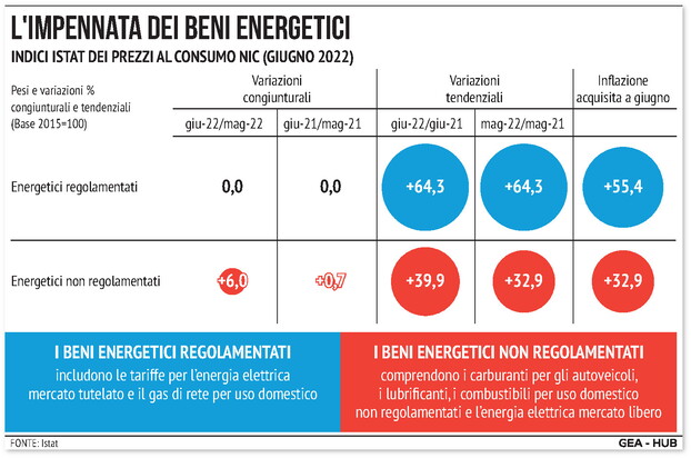 A giugno l’inflazione accelera di nuovo salendo a un livello (+8,0%) che non si registrava da gennaio 1986 (quando fu pari a +8,2%). Le tensioni inflazionistiche continuano a propagarsi dai beni energetici agli altri comparti merceologici, nell’ambito sia dei beni sia dei servizi. Lo sottolinea l’Istat a commento dei dati definitivi di giugno. Pertanto, i prezzi al consumo al netto degli energetici e degli alimentari freschi (componente di fondo; +3,8%) e al netto dei soli beni energetici (+4,2%) registrano aumenti che non si vedevano rispettivamente da agosto 1996 e da giugno 1996. Al contempo, l’accelerazione dei prezzi degli alimentari, lavorati e non, spingono ancora più in alto la crescita di quelli del cosiddetto “carrello della spesa” (+8,2%, mai così alta da gennaio 1986, quando fu +8,6%).