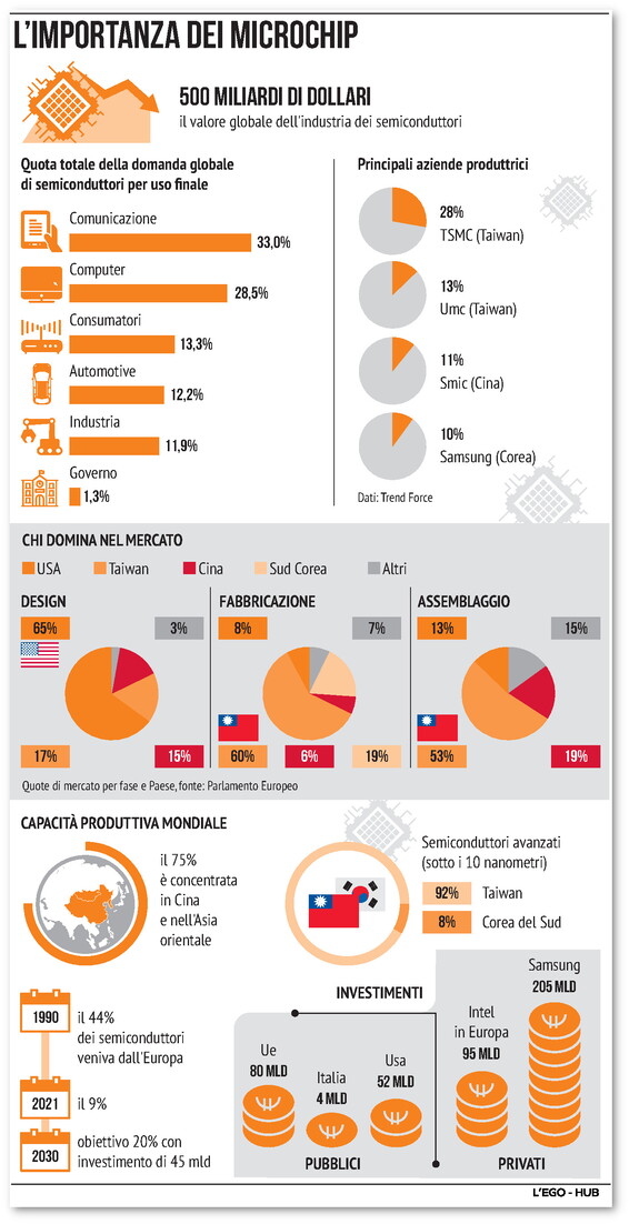 Si stima che il mercato globale dei semiconduttori raddoppierà in questo decennio, la produzione europea dovrà quadruplicare. Per farlo, la Commissione europea ha approvato un forte sostegno pubblico. Bruxelles prevede sovvenzioni per 12 miliardi (6 miliardi dall’Ue e 6 dagli Stati) per finanziare la ricerca di chip più innovativi e lo sviluppo di linee di produzione. Per favorire la realizzazione di impianti di grandi dimensioni e l’innovazione delle piccole imprese, saranno autorizzati 30 miliardi di aiuti pubblici da parte degli Stati membri alle industrie del settore, compresi gruppi extra-europei, come Intel, intenzionati a investire in Europa.