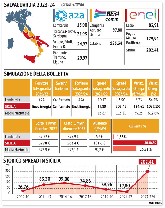 E in Sicilia, secondo gli esperti di BenchSmart-Controllabolletta, «si registra il nuovo record mondiale di maggiorazione sulla fornitura di energia elettrica». Perché Enel Energia, che s’è aggiudicata il servizio nell’Isola (oltre che in altre quattro regioni) ha fissato un “parametro Omega” pari a 202,41 euro a MWh per il 2023/24. Nello scorso biennio il sovraccosto era di 17,80 euro: è aumentato del 1.037,1%. Ciò significa che enti pubblici e aziende che in Sicilia stanno dentro il mercato di salvaguardia pagheranno in bolletta 562,4 euro a MWh, Per capire il livello del disastro basta fare un paragone con la Lombardia. Dove, grazie a un rating migliore di aziende ed enti, l’azienda che s’è aggiudicata il servizio - la A2A - pratica un “parametro Omega” di appena 15,90 euro, a fronte di una media nazionale salita a 113,11. A conti fatti, un sindaco o un imprenditore lombardo - a parità di regime di mercato, di servizio ricevuto e di Pun - pagheranno nei prossimi due anni 375,9 euro a MWh. Quasi 200 in meno che in Sicilia.