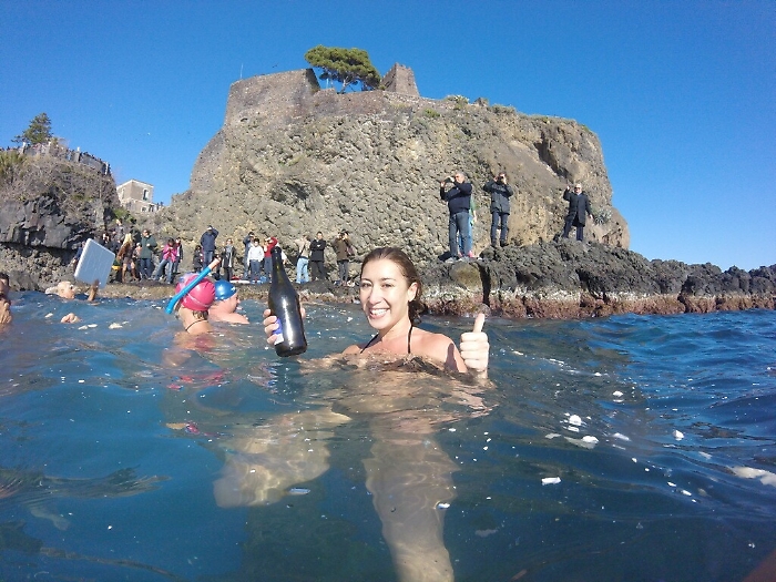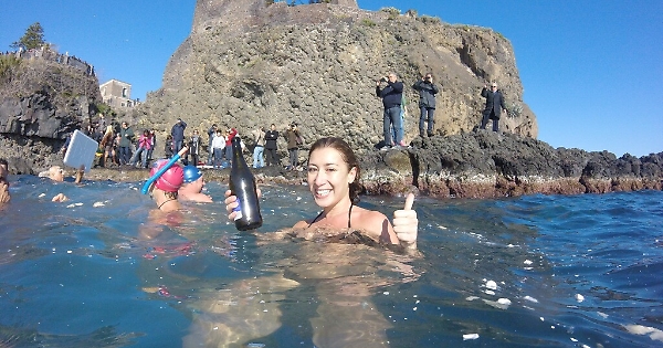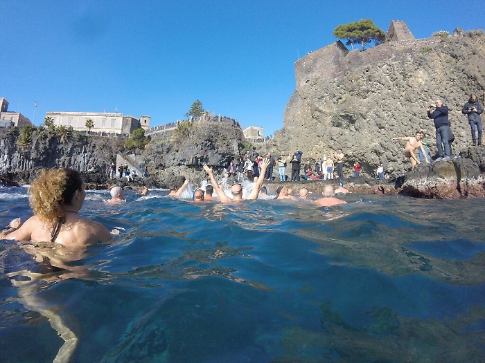 Complice il bel tempo, sebbene le temperature siano molto rigide, sono stati tanti i siciliani che hanno salutato l'arrivo del nuovo anno con un bagno a mare. Ad Agrigento, ma anche ad Aci Castello, nel Catanese.