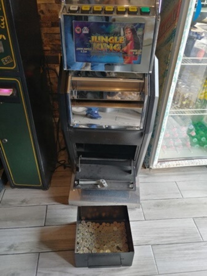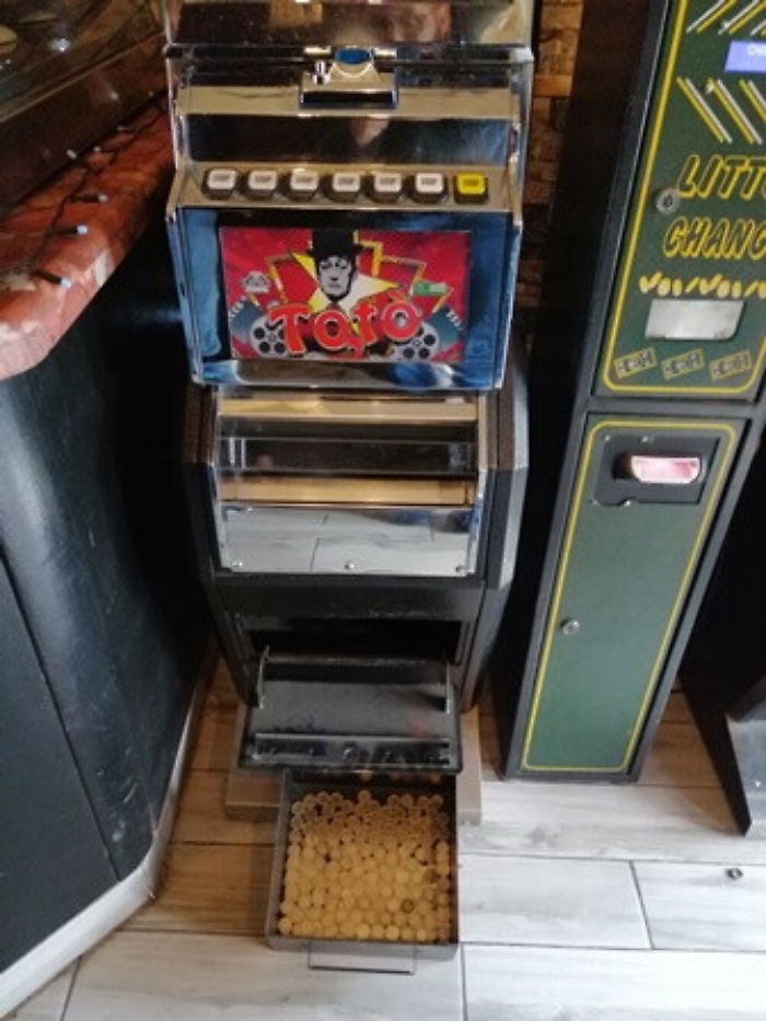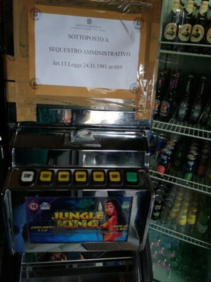 All’interno della rivendita sono stati identificati una donna addetta alla somministrazione di alcolici e il titolare dell’attività. Gli agenti hanno trovato, installati in un lato del negozio, 2 apparecchi da gioco per le vincite in denaro, completi di due gettoniere; in essi erano custoditi gli incassi, per un importo totale di euro 553,00. Per la messa in funzione di tali apparecchiature è necessaria la licenza del questore che le due persone trovate all’interno dell’esercizio non hanno assolutamente fornito, mostrando pure reticenza sulla loro provenienza e utilizzo.