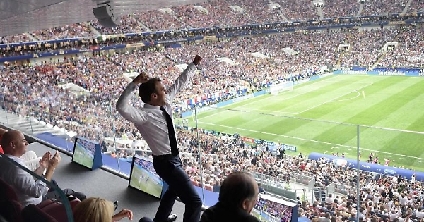 epa06890734 French President Emmanuel Macron (L) celebrates the 2-1 lead next to Croatian President Kolinda Grabar-Kitarovic (R) during the FIFA Worl