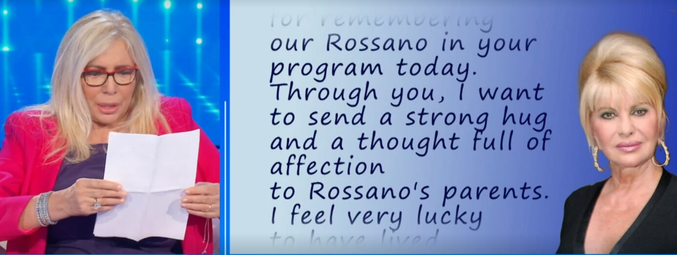 «Anche se amava troppo la vita per lasciarci così presto, so che il suo spirito vivrà sempre e ovunque. Riposa in pace», ha scritto Ivana Trump che aveva sposato in quarte nozze Rossano nel 2008 e che ha voluto rivolgere «un forte abbraccio e un pensiero pieno di affetto ai genitori». In studio anche Claudio Rubicondi, il padre dell’ex modello, e in collegamento dall’America l’amico Roberto Manfè che ha raccontato gli ultimi giorni di vita di Rubicondi e il momento drammatico in cui lo ha trovato senza vita: «Lo abbiamo trovato lì, non c'era più nulla da fare purtroppo. Non è stato bello nella maniera più assoluta, sono cose che non dimentichi».