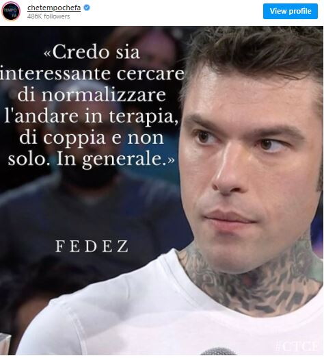 Fedez domenica scorsa è stato ospite di Fabio Fazio e ha raccontato che lui e la moglie seguono una terapia di coppia. «Credo che la cosa più interessante sia cercare di normalizzare l’andare in terapia, di coppia e non solo», ha dichiarato il cantante. «In generale. Non sono un bravo recensore, però è stato molto interessante». Il tema sarà tra gli argomenti toccati dalla serie tv. Nel filmato si vede Chiara che si lamenta dell’umore altalenante del marito, che quando è in “buona” è simpaticissimo, ma se è in una giornata “no” pare “incontattabile” e quasi incapace di alzarsi dal divano.