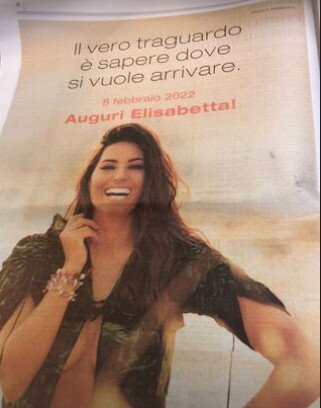 E accanto a lei anche l'ex marito Flavio Briatore, ultimamente sempre più vicino alla showgirl da cui si è separato diversi anni fa. Sarà stato lui ad acquistare quella pagina per augurare buon compleanno all'ex compagna? "Il vero traguardo è sapere dove si vuole arrivare. Auguri Elisabetta", è il messaggio a tutta pagina con una foto della destinataria in primo piano.