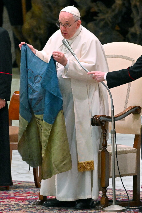 «Ieri, proprio da Bucha, mi hanno portato questa bandiera», ha detto papa Francesco al termine dell’udienza generale nell’Aula Paolo VI parlando del massacro nella città ucraina e mostrando una bandiera di colore azzurro e verde.  «Questa bandiera viene dalla guerra - ha spiegato -, proprio da quella città martoriata Bucha». «E anche ci sono qui alcuni bambini ucraini che ci accompagnano, salutiamoli e preghiamo insieme con loro», ha aggiunto facendo salire sul palco vicino a lui un gruppo di bambini, alcuni recando anche disegni.
