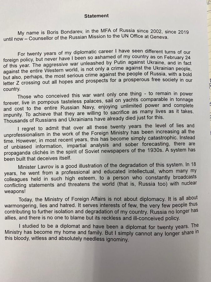 Un consigliere della missione russa alle Nazioni Unite a Ginevra, Boris Bondarev, si è dimesso dal suo incarico per denunciare l’invasione dell’Ucraina. Lo afferma l'ong UN Watch, che ha pubblicato la lettera di congedo del diplomatico. «Non mi sono mai vergognato così tanto del mio Paese», si legge nel testo, che descrive la guerra di Mosca come «il crimine più grave contro il popolo russo», commesso da parte di un gruppo dirigente «che vuole solo una cosa, cioè restare al potere per sempre».