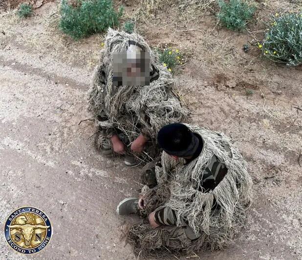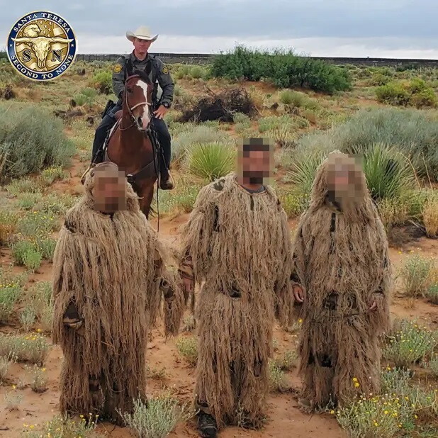 Tre immigrati illegali con abiti mimetici "straordinari" destinati ad aiutarli a mimetizzarsi nel deserto del New Mexico sono stati trovati dagli agenti della Border Patrol. Le immagini pubblicate sugli account dei social media della Border Patrol mostrano il trio che indossa i cosiddetti abiti ghillie, che sono spesso usati dai cacciatori per mimetizzarsi nel deserto. In questo caso, i travestimenti dovevano assomigliare a sterpaglia secca nel deserto vicino a Santa Teresa, nel New Mexico. Nonostante la mimetizzazione, gli immigrati sono stati avvistati dagli agenti della Border Patrol.