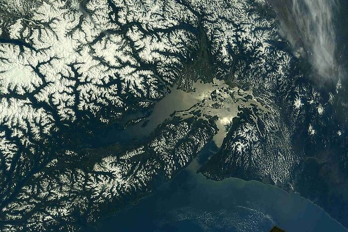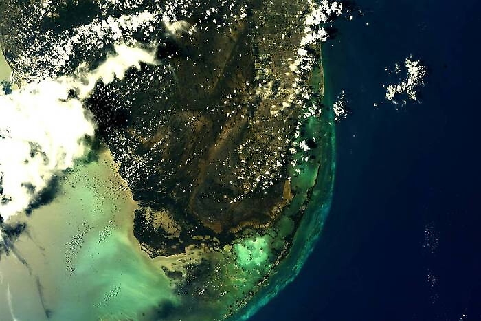 Il "fiume d'erba" della regione paludosa delle Everglades, in Florida, fotografato dall'astronauta Ricky Arnold; Bianco, grigio e azzurro dominano il paesaggio ghiacciato del suolo russo attraversato dal fiume Dnieper e, a proposito di ghiacci, nella rassegna della Nasa non poteva mancare l'iceberg quadrato della Penisola Antartica, reso celebre dai social media.