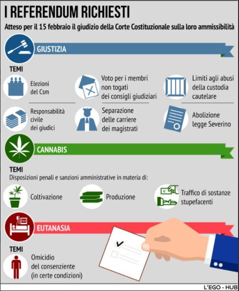Martedì 15 febbraio la Corte Costituzionale deciderà sul futuro di otto quesiti referendari, sei sulla giustizia, uno sull'eutanasia e uno sulla depenalizzazione di coltivazione e uso personale della cannabis. I quindici giudici della Consulta dovranno decretare l'ammissibilità o meno dei referendum.