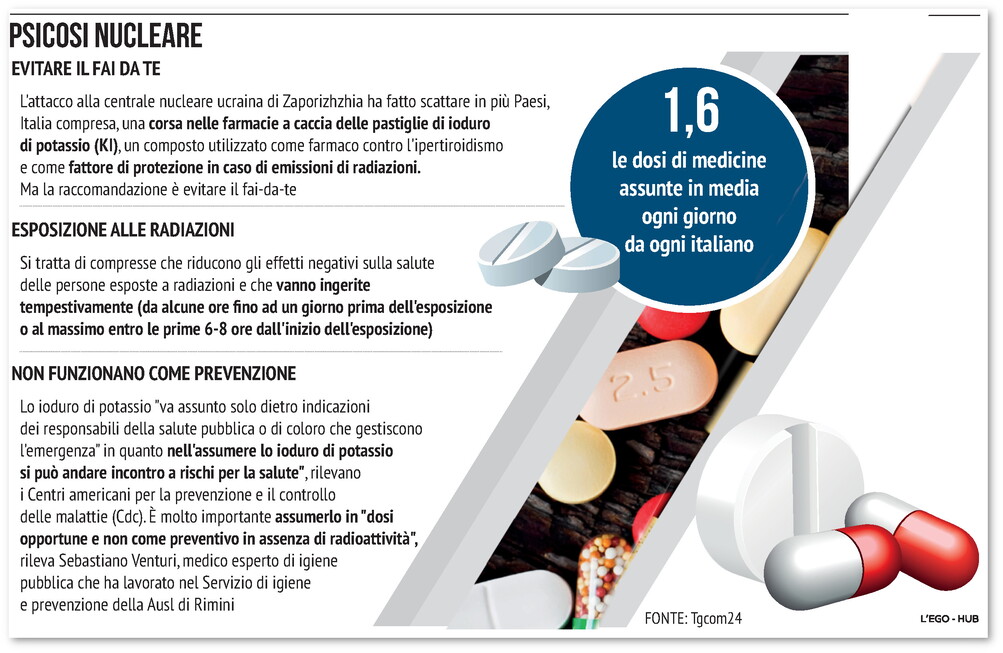 Le cronache danno conto di un’accresciuta richiesta delle pillole in diverse zone del Paese e la Protezione civile ed il ministero della Salute hanno attivato una ricognizione sulle riserve. Mentre gli esperti invitano ad evitare il fai-da-te: è molto importante assumerlo in «dosi opportune e non come preventivo in assenza di radioattività», avverte Sebastiano Venturi, medico esperto di igiene pubblica. Utilizzato in seguito all’incidente nella centrale di Chernobyl, nel 1986, è un sale di iodio stabile, ossia non radioattivo, in grado di bloccare l’assorbimento dello iodio radioattivo da parte della tiroide.