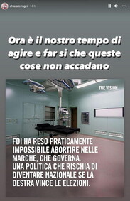 ''Ora è il nostro tempo di agire e far si che queste cose non accadono'', scrive Chiara Ferragni in una storia su Instagram, con sullo sfondo la foto di una sala operatoria. L'intervento è politico perché, denuncia ''FdI ha reso praticamente impossibile abortire nelle Marche che governa. Una politica che rischia di diventare nazionale se la destra vince le elezioni''. Le Marche da cui, proprio ieri è partita la campagna elettorale della leader Fdi Giorgia Meloni sul palco ad Ancona.