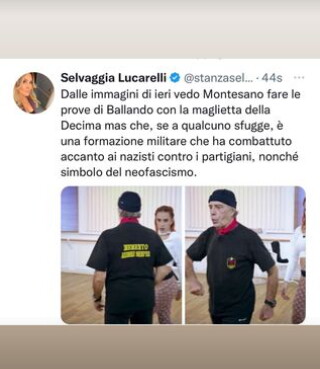 «Giusto per chiarire, perché leggo la solita dietrologia da bar. Insinuare che qualcuno possa avermi suggerito di scrivere della maglietta di Montesano per creare il caso della settimana, vuol dire non capire nulla di tv ed equilibri annessi. Faccio la giornalista, ho una notizia, la do». Così Selvaggia Lucarelli, giudice di Ballando con le stelle, torna sulla vicenda della maglietta con il simbolo della Decima Mas indossata da Montesano durante le prove del programma di Rai1, vicenda da lei stessa denunciata sui social.