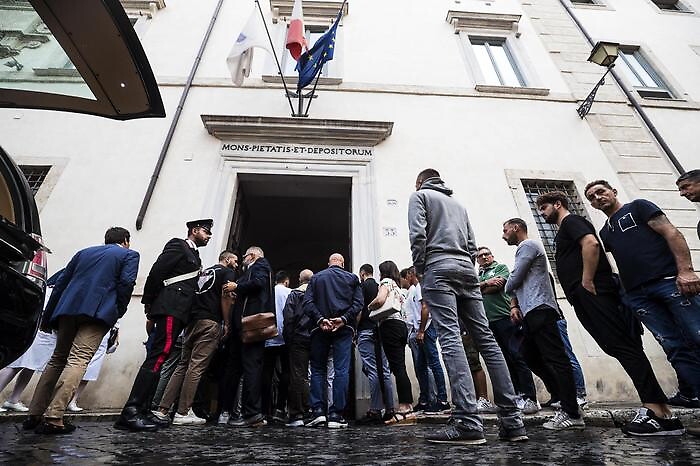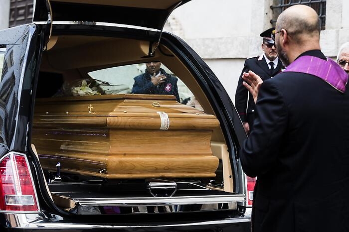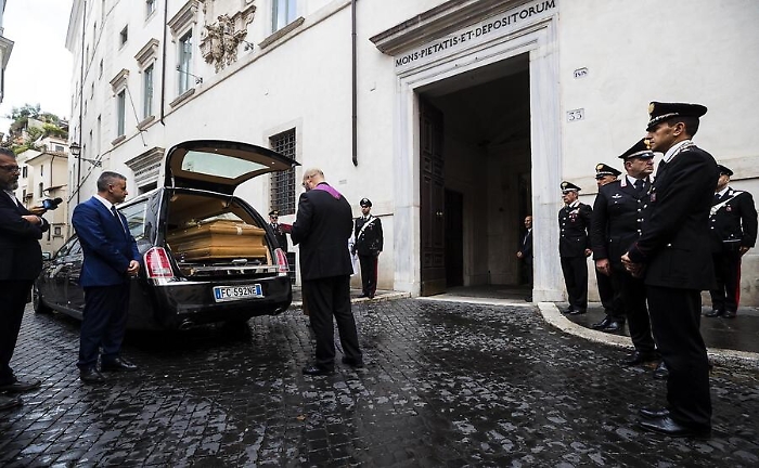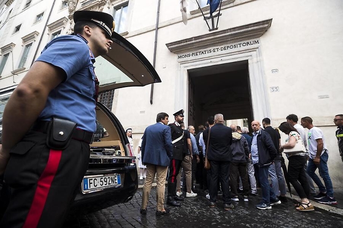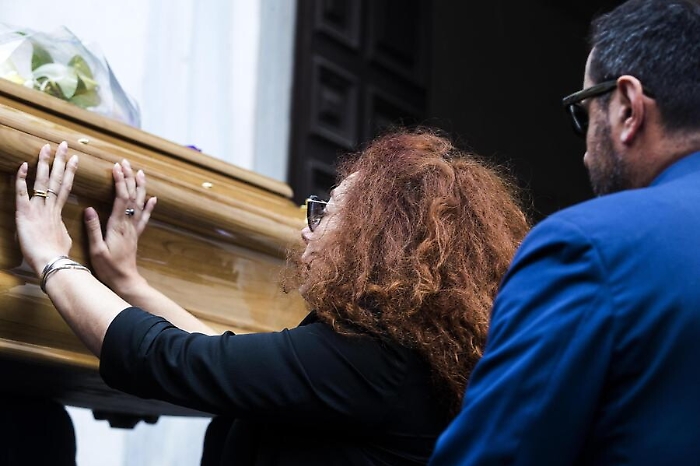 Roma - Tocca la bara del marito e quasi si appoggia con entrambe le mani, la moglie del vice brigadiere dei Carabinieri Mario Cerciello Rega, ucciso il 26 luglio da un giovane americano che è stato arrestato. Un dolore composto, come quello della gente che numerosa, sta affollando in queste ore Piazza del Monte di Pietà dove è stata allestita la camera ardente dello sfortunato militare. La moglie (si erano sposati poco più di un mese fa a Somma Vesuviana), è arrivata in Piazza del Monte di Pietà alle 15,30. Stretta in un tailleur pantalone blu, sotto una camicia bianca, Rosa Maria veglia il feretro del marito Mario Cerciello Rega. I suoi occhi sono gonfi per tutte le lacrime che hanno pianto. Intorno a lei, immobile nel suo dolore, il viavai delle migliaia di persone e appartenenti alle forze dell’ordine che sono venuti a dare l’ultimo saluto al vice brigadiere ucciso il 26 luglio. Le telecamere, per volontà dei familiari della vittima, non sono ammesse all'interno della camera ardente.