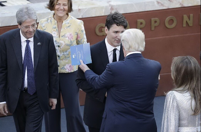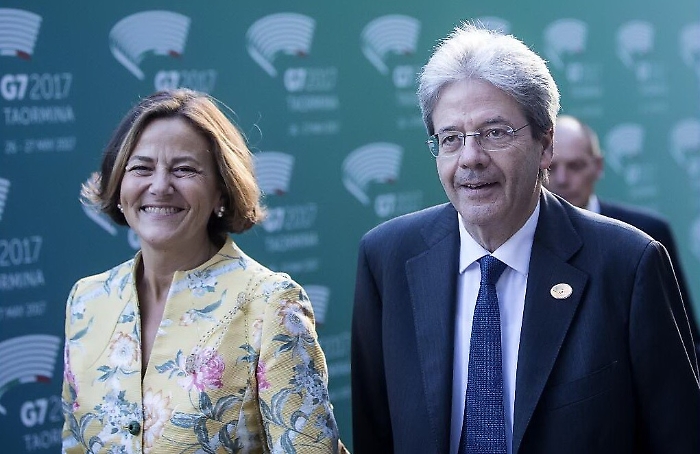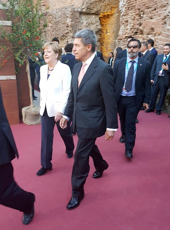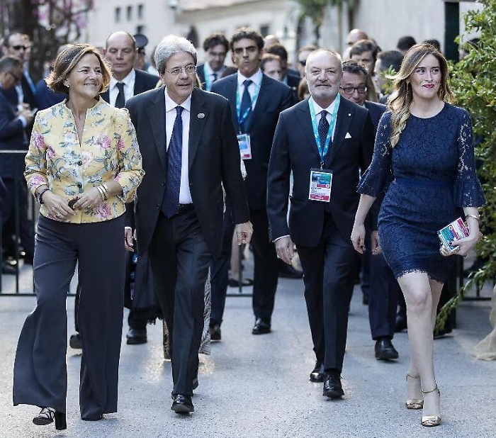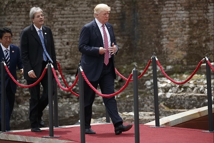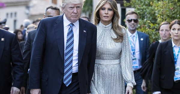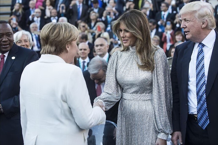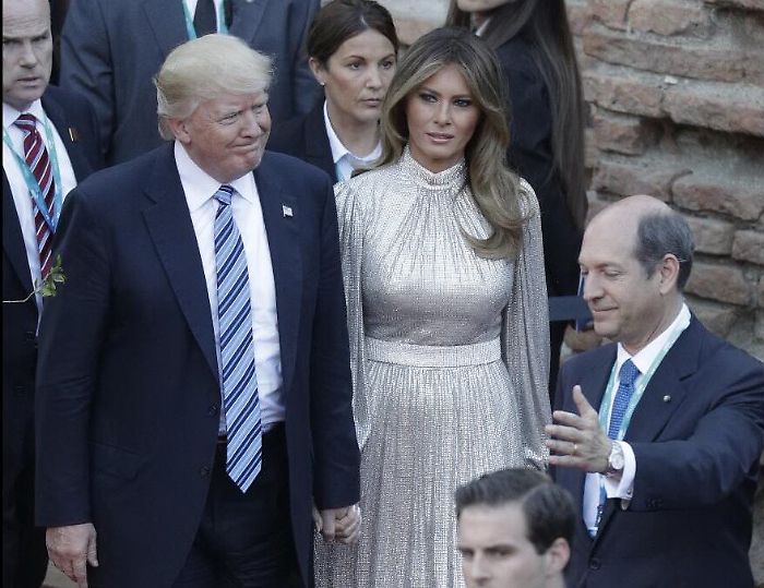 TAORMINA (MESSINA) - I leader del G7 e le loro consorti stanno arrivando al Teatro Greco di Taormina per assistere al concerto della Filarmonica della Scala. Ancora una volta i riflettori sono puntati su Melania Trump e Brigitte Macron. La first lady americana, mano nella mano con Donald Trump, ha indossato un abito longuette glitterato, con le maniche a sbuffo e collo alto. Decolleté argentate in tinta, ricoperte di cristalli.