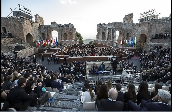 G7, Melania incanta in argento al teatro greco per concerto Filarmonica