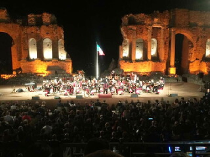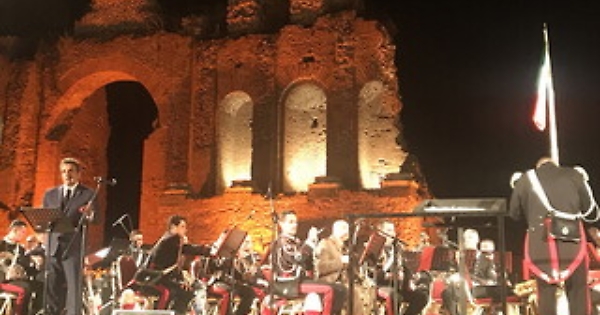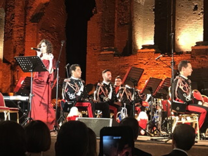 TAORMINA (Messina) - Serata magica con un pubblico delle grandi occasioni quella di ieri al Teatro Antico di Taormina per il concerto “Note Musicali sotto le stelle, dal cuore dell'Arma del nostro Sud”, evento di beneficenza promosso dal comandante interregionale dei Carabinieri “Culqualber”, generale di corpo d’armata Luigi Robusto, e presentata dall’attore e conduttore televisivo Flavio Insinna, che, nello splendido scenario taorminese ha unito Sicilia e Calabria in un momento importante per manifestare, anche attraverso la musica, la vicinanza dei carabinieri alle realtà che li circondano, al territorio e alla gente, oltre che occasione per una raccolta fondi, in collaborazione con la Croce Rossa Italiana, i cui proventi verranno devoluti agli orfani dei militari dell’Arma dei Carabinieri assistiti dall’Opera Nazionale assistenza orfani dei militari dell’Arma dei Carabinieri (Onaomac). Tante le autorità presenti, civili, militari e religiose, dal sindaco di Taormina Mario Bolognari al presidente della Regione siciliana Nello Musumeci, l’arcivescovo di Messina Giovanni Accolla e l’ausiliare Cesare Di Pietro, il prefetto di Messina Maria Carmela Librizzi e altri rappresentanti del Governo di Sicilia e Calabria, membri dell’Arma e di altre Forze armate delle due regioni, politici e anche tanti cittadini e turisti che hanno gremito in ogni ordine di posti il Teatro Antico, assistendo per tre ore al concerto tra musica e gag messe in scena con simpatia e spontaneità da Insinna, il capitano Anceschi della serie tv Don Matteo.