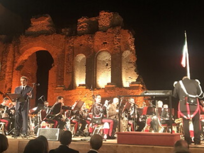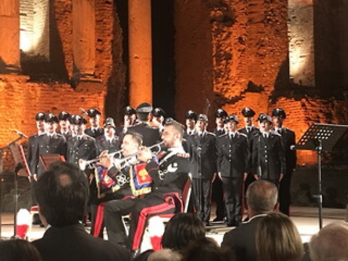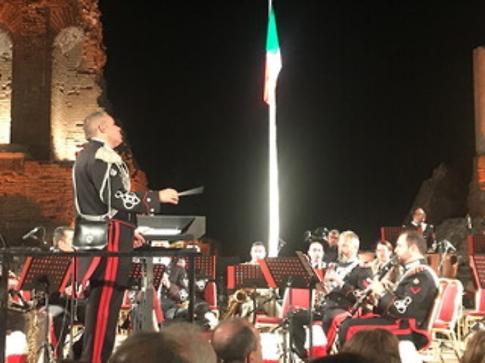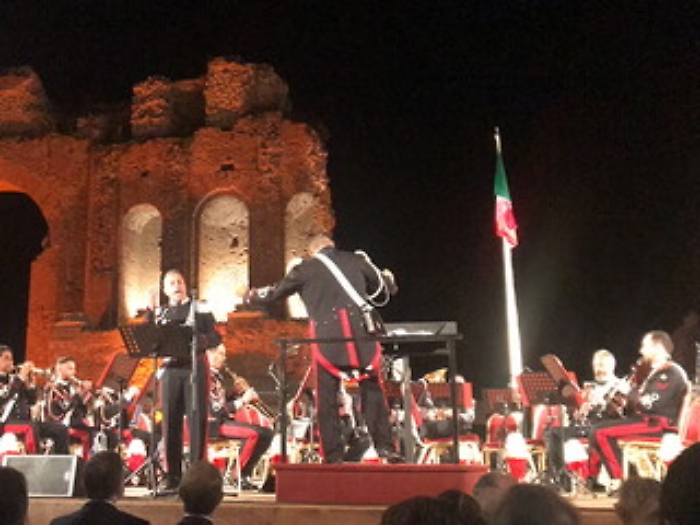 “Anche in un’occasione come questa l’Arma dei Carabinieri si avvicina alla gente – ha detto il generale Robusto chiamato sul palco dal presentatore – quale simbolo assoluto di legalità, valorizzazione e tutela della persona. Per noi è la prima volta su questo palcoscenico, una serata preziosa per dare valore a una divisa che anche così viene maggiormente apprezzata, indossata da uomini e donne che credono nello Stato e sono convinti che per fare sul serio occorre anche scherzare come fatto stasera”. “Ci vuole animo per presentarsi davanti a questo pubblico in questo teatro – ha aggiunto Insinna – la musica rende il mondo più bello e oggi anche voi l’avete resto migliore”. Il generale Robusto ha poi donato al presentatore una sciabola come segno di gratitudine di tutta l’Arma dei Carabinieri per aver prestato il suo volto all’evento. Prologo del concerto “Note Musicali sotto le stelle, dal cuore dell'Arma del nostro Sud”, è stata nella mattinata di ieri la cerimonia dell’alzabandiera al Teatro Antico, con le scolaresche degli istituti del comprensorio, accolte dal sindaco Mario Bolognari e dal capitano Arcangelo Maiello, comandante della Compagnia Carabinieri di Taormina. Poi la Fanfara del 12° Reggimento Carabinieri Sicilia ha sfilato lungo il corso Umberto I, esibendosi in piazza IX Aprile.