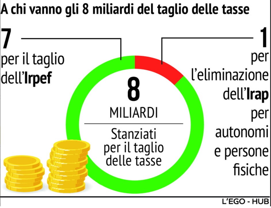 Accordo politico tra le forze di maggioranza sul taglio delle tasse con l’Irpef che scende da 5 a 4 scaglioni. La fascia di reddito fino a 15mila resta al 23%, quella 15-28mila va dal 27% al 25%, quella 28-50mila va dal 38% al 35%, mentre oltre i 50mila si passa direttamente al 43%.