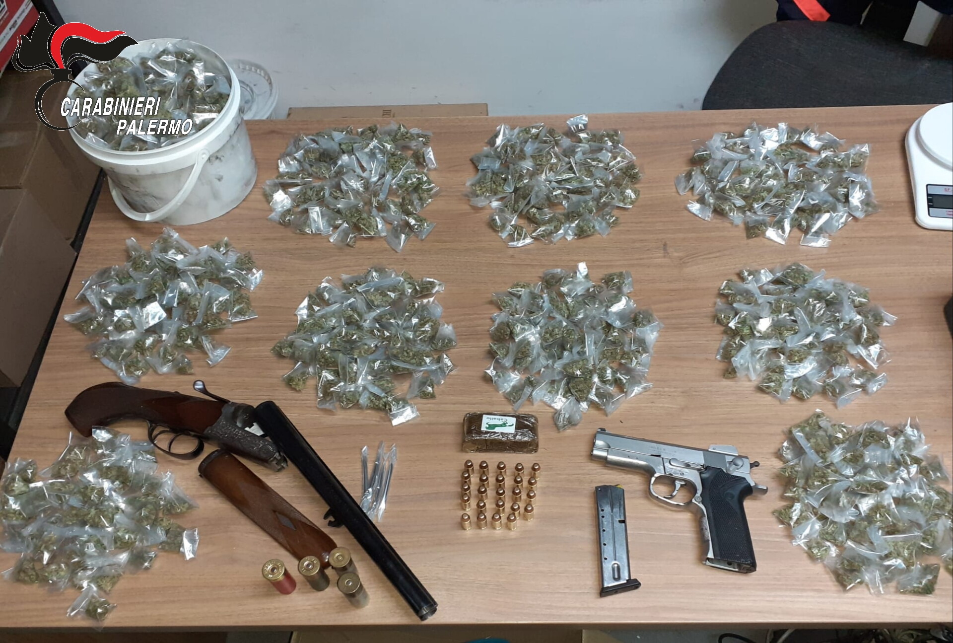 Due fratelli di 32 anni e 27 anni sono stati arrestati a Palermo dai carabinieri del comando provinciale con l’accusa di spaccio di droga e detenzione di armi nel rione Zen 2. I militari nel corso di un controllo con l'utilizzo dei cani antidroga hanno trovato in un magazzino in via Marchese Pensabene un fucile calibro 12 a canne mozzate, modificato artigianalmente, una pistola con matricola cancellata calibro 40, oltre 500 munizioni e 650 grammi complessivi tra marijuana e hashish.