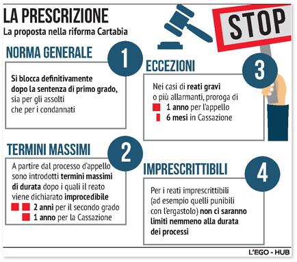 Tuttavia, secondo il ministro Cartabia, «non si poteva evitare di correggere gli effetti problematici di quella riforma. Per questo abbiamo stabilito tempi certi e predeterminati per la conclusione dei giudizi di appello e Cassazione. Giudizi lunghi recano un duplice danno: frustrano la domanda di giustizia delle vittime e ledono le garanzie degli imputati. La riforma proposta vuole rimediare ad entrambi questi problemi. Non è un banale compromesso politico, è ispirata al bilanciamento tra quelle due esigenze: fare giustizia, nel rispetto delle garanzie - ha concluso - questo è ciò che ci chiede la Costituzione: bilanciamento fra principi, proporzionalità tra valori, equilibro tra esigenze in conflitto».