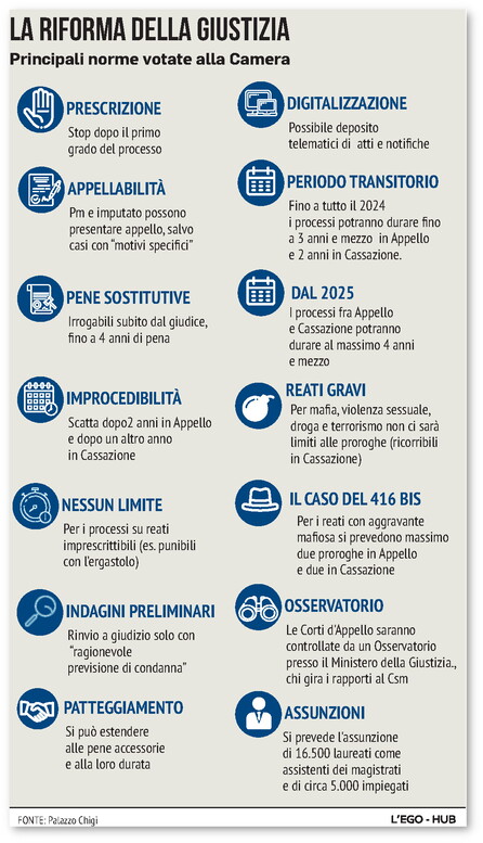 A imporre i tempi stretti è l’Ue, che nel Pnrr ha legato l'arrivo dei fondi del Recovery plan alla drastica riduzione dei tempi pachidermici dei processi penali in Italia (-25% in cinque anni). Una cavalcata che solo negli ultimi tre giorni è passata per la votazione delle pregiudiziali domenica, per la doppia fiducia nella notte tra lunedì e martedì e una lunghissima giornata in aula iniziata oggi poi alle nove di mattina per la discussione degli ordini del giorno al testo delle riforma, che più volte hanno messo alla prova la tenuta della maggioranza.