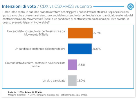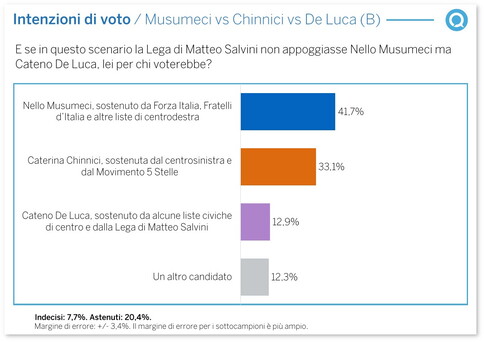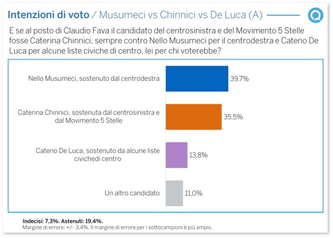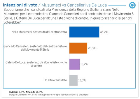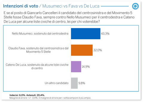 Il sondaggio ipotizza anche una situazione di centrodestra spaccato: il governatore «sostenuto da Forza Italia, Fratelli d’Italia e altre liste di centrodestra» avrebbe il 41,7%, mentre De Luca sarebbe penalizzato dall’appoggio della Lega, scendendo al 12,9; Chinnici, in questa strana contesa a tre (non c’è la proiezione dell’asse Meloni-Musumeci in solitaria contro il resto della coalizione), otterrebbe il 33,1%. Hanno sempre un peso gli indecisi (dal 6 all’11,1%) e i potenziali astenuti (fra il 19,4 e il 22,4%). Musumeci vince anche nei pronostici: a prescindere da come voterà, il 28% pensa che sarà lui il prossimo presidente della Regione; a seguire De Luca (16%), Fava (9%), Chinnici e Cancelleri (6%).
