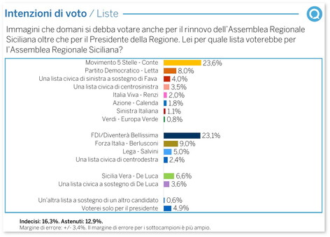 Interessanti le intenzioni di voto per l’Ars. Anche questo sondaggio conferma il M5S (23,6%) prima forza in Sicilia, di una spanna sopra FdI-Db (23,1%). Tutti gli altri partiti non raggiungono la doppia cifra: Forza Italia al 9%, il Pd all’8%, la Lega al 5%. Nel centrosinistra spiragli per una lista Fava (4%), mentre tutti gli altri sono dal 2% in giù; significativa la proiezione per Sicilia Vera, il movimento di De Luca, che col 6,6% sarebbe la quinta forza rappresentata all’Ars (superando Matteo Salvini), con un ulteriore 3,6% per una seconda lista civica.