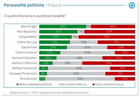 Il sondaggio misura anche notorietà e fiducia dei vari player in campo. Musumeci è conosciuto dal 95% dei siciliani (terzo dietro Mario Draghi e Giorgia Meloni, gli unici personaggi nazionali citati), con un buon distacco dall’onnipresente De Luca (73%), da Gianfranco Miccichè (71%) e da Fava (61%). Meno noti gli altri: Cancelleri 52%, Chinnici 45%, Peppe Provenzano 41%, Raffaele Stancanelli 37%, Nino Minardo 27%. E, al lordo di chi non li conosce, è emblematica anche la classifica della fiducia. Su Musumeci ne ha «molta o abbastanza» il 40% e «poca o nessuna» il 53%. Un dato sovrapponibile al giudizio sull’operato del governatore uscente: positivo per il 44% (appena il 6% molto; 38% abbastanza) e negativo per il 53% (abbastanza il 36% e molto il 17%). La bocciatura è netta (86%) per chi dichiara di votare De Luca, più contenuta (59%) fra gli elettori di Chinnici: ovviamente, per chi è propenso al voto per l’uscente, prevale il giudizio positivo per  il 72%. Ma, sul versante dell’apprezzamento, gli altri nomi in lizza non sfondano. Soltanto per Chinnici il sentiment favorevole (22% di molta-abbastanza fiducia) prevale su quello negativo (21% di poca-nessuna fiducia), mentre Fava si attesta su una parità: 29% contro 29%. Il peggiore è Miccichè (14%-55%), ma risultati poco confortanti anche per Cancelleri (18%-34%), Stancanelli (9%-26%), Provenzano (8%-31%) e Minardo (6%-21%).