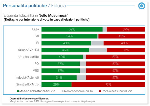 Ed è proprio dalla dicotomia fiducia-sfiducia che arriva un altro spunto per il dibattito sulla ricandidatura. Dato per scontato che Musumeci non gode del consenso di chi dichiara l’intenzione di voto per Pd e M5S (stesso dato negativo: 57%), fa una certa impressione scoprire che i più “fiduciosi” sul presidente della Regione siano gli elettori della Lega col 59%, seguiti da quelli di FdI (54%) e Fi (48%). Anche nell’elettorato moderato di Italia Viva, Azione e +Europa la fiducia (46%) prevale sulla sfiducia (37%).