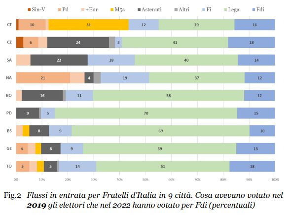 Da dove arriva dunque questa grande quantità di voti che Fdi è riuscita ad aggiungere al proprio bacino elettorale? Secondo l’istituto Cattaneo gli spostamenti rispetto al 2018 si nota che in maggioranza si tratta di un rimescolamento interno al centrodestra: un gran numero di voti passa da Forza Italia e dalla Lega al partito oggi egemone nella coalizione. Di significato politico molto più rilevante è il flusso che proviene dal bacino elettorale del centrosinistra e in alcune città soprattutto dal M5s. Come si intuisce dal grafico successivo, si tratta con tutta probabilità di elettori già transitati verso la Lega nel 2019. Se infatti si osservano i flussi in entrata per Fdi dalle europee del 2019 il quadro muta: in questo caso si tratta in larga prevalenza di scambi interni alla coalizione di centrodestra. Gli ulteriori voti in arrivo da elettori ex M5s e ex-Pd alla Meloni sono in genere limitati, almeno al centronord. Le città del Sud si caratterizzano per una mobilità elettorale elevata e una fedeltà partitica abbastanza debole: in questo caso i voti in arrivo dal centrosinistra sono in numero maggiore. Eclatante il caso di Catania, dove va considerato anche un effetto della candidatura al Parlamento di Nello Musumeci.
