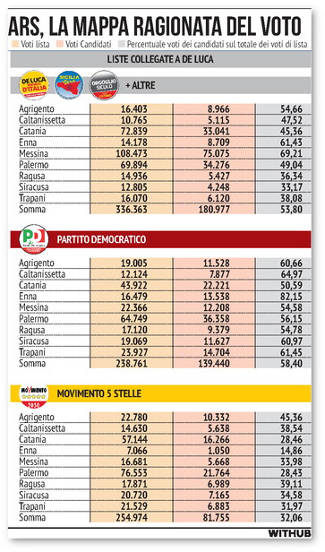 Un dato importante: l’incidenza delle preferenze sulle liste s’abbassa di tanto se si considera solo l’“ammiraglia” De Luca Sindaco di Sicilia, in cui influisce per appena il 43%, con punte minime a Siracusa (30%), Catania e Trapani (34%). Ciò significa che in fondo la strategia elettorale di “Scateno” era corretta: puntare su un simbolo forte, trascinato dal suo consenso personale, a cui aggiungere i voti raccolti da 173 candidati disseminati in tante altre liste. Ma ha fatto male i conti: gli sono mancati i “signori delle preferenze”. Gli stessi decisivi per la vittoria di Schifani.