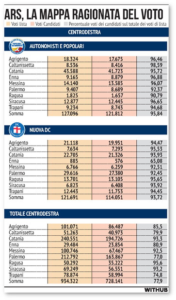 Tirando le somme, dunque, i padroni del consenso hanno trascinato la vittoria di Schifani: nell’Isola il centrodestra sale dal 35% alle Politiche al 42% alle Regionali, sfruttando sì il voto “politico” di Meloni (e in parte di Berlusconi), ma col contributo decisivo dei candidati di Autonomisti, Nuova Dc e anche della Lega. Sul totale di 934.322 voti di coalizione, ben 728.141 sono con preferenze: quasi il 78%, con picchi a Ragusa (95%), Catania e Siracusa (93%). Un dato che il presidente, anche dalle prime fasi della trattativa sulla composizione della giunta, con «assessori-politici competenti» (si presume quasi tutti deputati eletti, «con qualche eccezione»), sembra avere ben chiaro in testa.