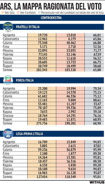 Nel centrodestra del neo-governatore Renato Schifani la matrice dei consensi è molto diversa. Fratelli d’Italia, il partito più votato alle Regionali, ha goduto evidentemente dell’effetto election day. Sui complessivi 28.345 voti di lista, infatti, ben il 35% è senza preferenza per i candidati. Un investimento di fiducia, in linea col trend delle Politiche, sulla futura premier Giorgia Meloni. Rispetto al 26% nazionale il risultato di FdI in Sicilia è stato molto inferiore: al Senato il 18,4%, alle Regionali il dato scende al 15,1%. Quanto basta, però, per essere la prima forza di centrodestra all’Ars, grazie però agli oltre 100mila voti soltanto al simbolo col nome Meloni. Gli unici deputati eletti all’Ars che hanno superato quota 10mila sono Alessandro Aricò (11.510) e Fabrizio Ferrara (10.468) a Palermo su 77.145 voti di lista; Gaetano Galvagno (13.961) e Dario Daidone (11.038) su 73.340 a Catania. Il collegio in cui i candidati pesano di più è Messina, 71,7%, trascinato dalle performance di Pino Galluzzo (8.951) ed Elvira Amata (7.008); a Trapani la metà dei circa 20mila elettori meloniani non ha scelto alcun candidato. Analogo trend a Enna; su 5.171 voti di lista (7,5%, di gran lunga il peggior risultato: meno della metà della media regionale), appena il 52,5% va ai candidati, fra cui Elena Pagana.