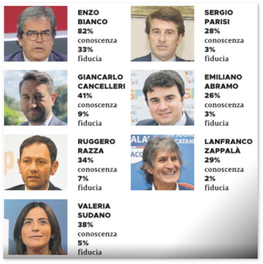 Quali sono i dati che alimentano l’ottimismo dell’entourage di Bianco? Il primo è di certo la misurazione del grado di conoscenza e di gradimento dei potenziali candidati. Più di otto catanesi su dieci, ovviamente, sanno chi è l’ex sindaco che li ha amministrati per tanti anni, mentre il 33% dichiara di fidarsi di lui. Risultati molto superiori ad altri sfidanti che vengono sondati da Emg Different: il più noto, ironia della sorte, è il neo-concittadino Giancarlo Cancelleri (41%), due volte candidato governatore col M5S, oltre che viceministro e sottosegretario col governo giallorosso, con un grado di fiducia al 9%. La deputata leghista Valeria Sudano supera Ruggero Razza per livello di notorietà (38% contro 34%), ma l’ex assessore regionale alla Salute la spunta di due punti (7 a 5) sulla fiducia. Più indietro il resto dei concorrenti: Sergio Parisi, ex assessore comunale di FdI, registra il 28% di notorietà e il 3% di fiducia, poi Emiliano Abramo, candidato alle Politiche col Pd, potenziale nome del centrosinistra (26% e 3%) e il civico Lanfranco Zappalà (29% e 2%).