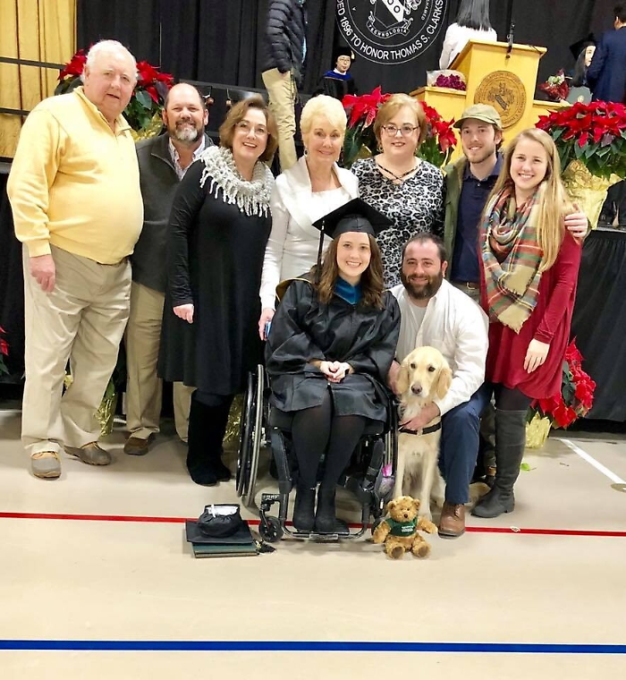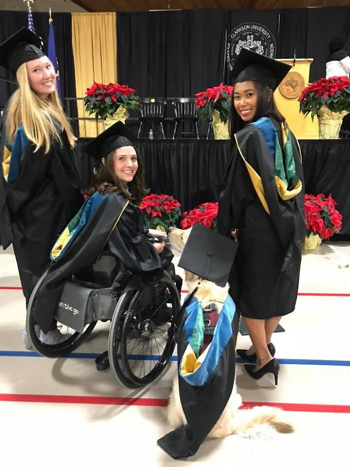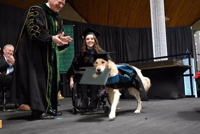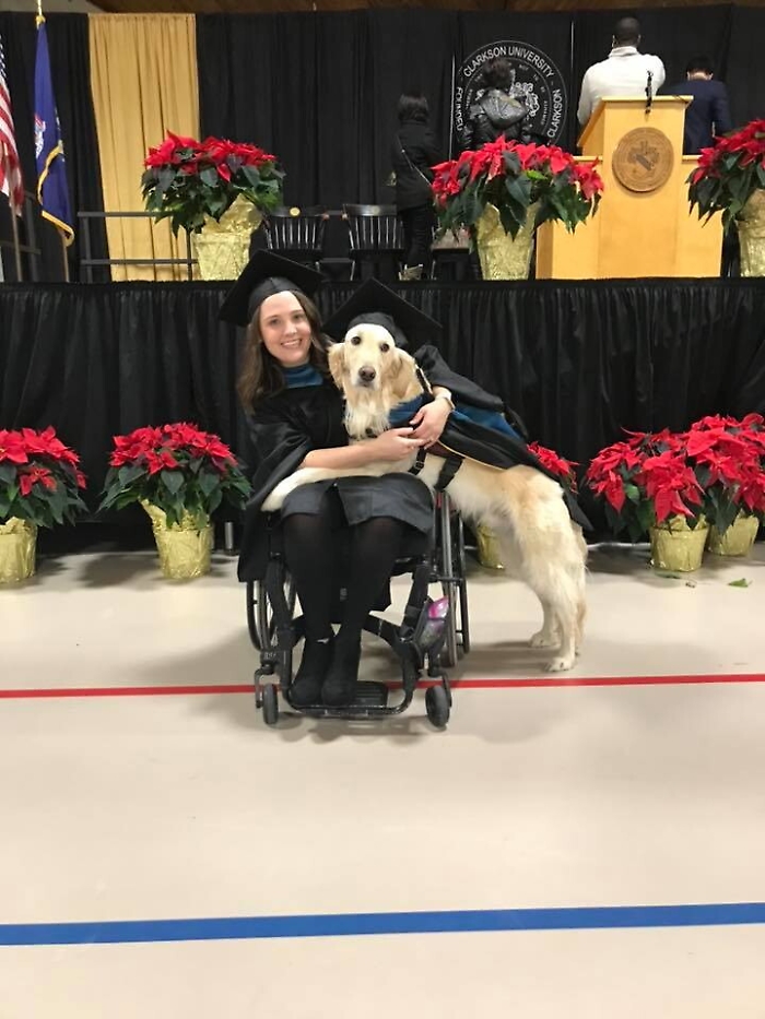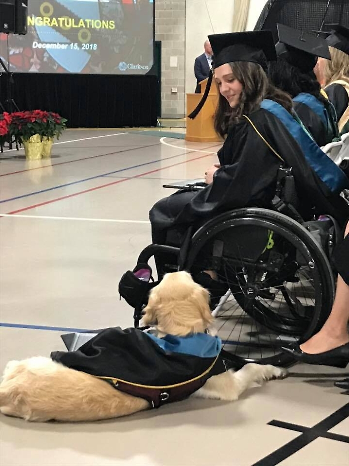 "Ho insistito perchè si laureasse anche lui sin dal primo giorno, ha fatto tutto quello che ho fatto io", ha spiegato la ragazza, che usa una sedia a rotelle per spostarsi e soffre di dolori cronici. Il cane la aiuta ad aprire le porte, ad accendere le luci e le porta gli oggetti che lei gli indica con un puntatore laser. Ma la cosa più importante è la vicinanza e il conforto che le offre ogni giorno tra dolori senza tregua, che causano depressione e ansia.