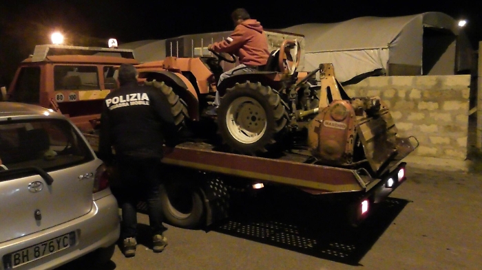 Nel corso di una perquisizione effettuata a Vittoria presso l’abitazione di M.A., la Polizia ha rivenuto un ingente quantitativo di mangime, biciclette, impastatrici per alimenti, macchina fotografica, un compressore ed un trattore su cui sono in corso specifici controlli per appurare se di provenienza furtiva. In questo caso il denunciato non aveva i documenti in regola rispetto alla tipologia di trattore ed il sospetto ha portato gli agenti a sequestrarlo per effettuare le opportune verifiche.