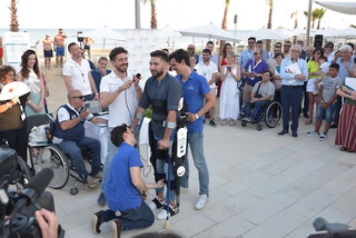 Marina di Ragusa (Ragusa) - Il mare di Marina di Ragusa a pochi passi. Un piccolo tratto di strada da percorrere, dopo 13 anni di immobilità, con lo sguardo rivolto verso quel mare. Ieri sera, un esoscheletro di ultima generazione ha “rimesso in piedi” Andrea També, un ex militare della Folgore, vittima di un incidente in moto e rimasto in sedia rotelle a soli 22 anni.