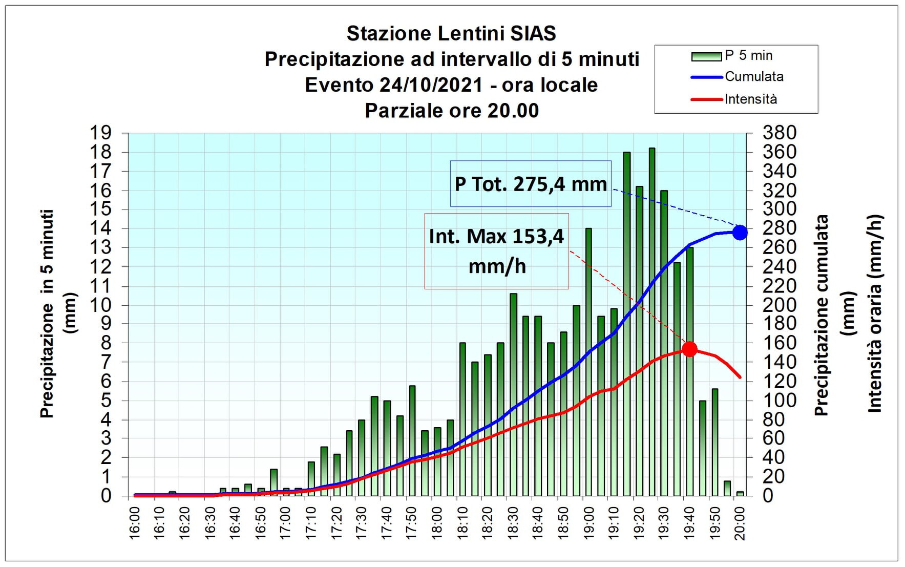 «Nell’ottobre del 1951 l’allora servizio idrografico regionale della Sicilia - aggiunge Vito Restivo - registrò alla stazione pluviometrica di Lentini 702 millimetri in meno di un giorno. Ieri non si è arrivati a quei livelli, ma c'è stata un’intensità di pioggia forte 153,4 millimetri tra le 18.40 e le 19.40. Tra le 19.20 e le 1925 il picco con un’intensità d’acqua davvero impressionante. Basta fare un raffronto. In Sicilia mediamente cadono in un anno circa 700 millimetri di pioggia. Sulle Madonie e sui Nebrodi la precipitazione va da 700 millimetri a 1000 millimetri in un anno. Sull'Etna e Linguaglossa si arriva a 1.200. Le aree della Sicilia settentrionale 700 millimetri, nel sud dell’isola tra 400 e 500 millimetri. Alla luce di questa comparazione è chiaro che se in due ore cadono 275,4 millimetri diventa un evento eccezionale». Domani sempre nella stessa zona centro orientale sono previsti ancora precipitazioni intense.