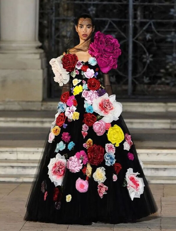 Il nero è il colore predominante: la cappa d’oro è un omaggio alla cappella del santissimo sacramento del Duomo. La Cattedrale con facciata ha ispirato la scelta del tutto bianco. Gli eleganti fregi in stile vengono riprodotti sull'abito con 380 fiori, così come enormi e sinuose volute vengono realizzate a mano utilizzando doppia organza di seta manipolata. Con un effetto di riccioli e foglie che si arrampicano su tutto il capo. Un abito realizzato all’uncinetto con base in tulle ricamato a mano riproduce i disegni degli antichi palazzi della tradizione siciliana con reti, fiori, orli smerlati, volute e foglie per riprodurre il pizzo siciliano assolutamente unico e classico: gli elementi vengono sovrapposti per creare un effetto tridimensionale quasi scultoreo. Protagonisti i puttini realizzati con crine e ovatta. Svettanti sulle spalle di un’esclusiva giacca in duchesse di cotone, putti modellati con micro drappeggi e petali cuciti a mano ricreano il bagliore e la lucentezza del marmo in un omaggio all’intramontabile barocco siciliano.