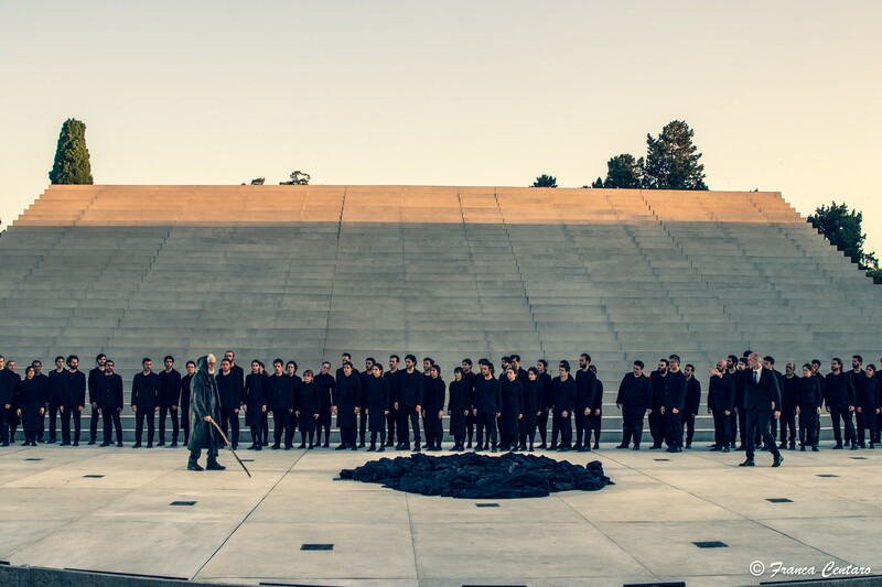 La scenografia, firmata da Radu Boruzescu (i costumi, lineari, tutto in bianco e nero, sono di Luis Carvalho) è una imponente scalinata, lunga 27 metri per 8 d’altezza, quasi a chiudere lo spazio del Teatro greco. «Rappresenta il potere, è la scala che porta alla reggia dove vivono Edipo, Giocasta e Creonte. Ma è anche un modo di “chiudere” il teatro in un abbraccio che coinvolge il pubblico». In scena il popolo dei tebani, un Coro di ben 80 attori, il numero più alto di sempre. «Il Coro è un vero protagonista, partecipa a ogni momento, chiede aiuto al re contro il morbo che li sta decimando, come il nostro Covid».