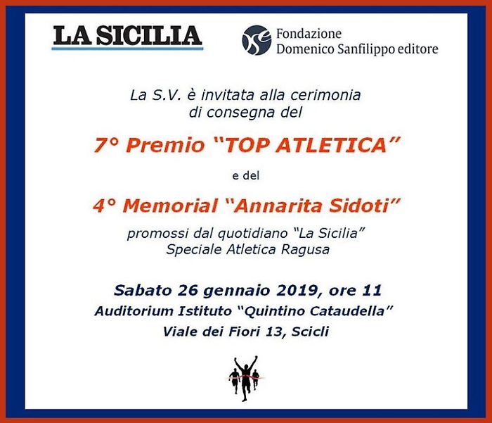 L'Auditorium dell'Istituto «Quintino Cataudella» di Scicli sarà teatro sabato 26 gennaio dalle 11 della settima edizione del premio «Top Atletica». L'evento, organizzato dal nostro quotidiano che dall'8 settembre del 2011 dedica ogni giovedì una pagina «Speciale Atletica Ragusa», con la collaborazione della Fondazione Domenico Sanfilippo Editore e della "scuola in movimento" di Scicli diretta dal preside, il prof. Enzo Giannone che è anche il sindaco di Scicli, vedrà salire sul palco le eccellenze dell'atletica del territorio ibleo scelti dai nostri lettori che hanno inviato oltre 500 mail dal 22 novembre al 31 dicembre 2018, per proclamare i vincitori delle sei sezioni in programma.