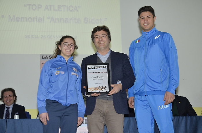Oltre 500 mail per decidere i campioni delle sei sezioni in programma che oggi nella splendida cornice dell'Auditorium dell'istituto "Cataudella" di Scicli, sono stati premiati dal direttore de La Sicilia Antonello Piraneo, affiancato da Domenico Ciancio della Fondazione Domenico Sanfilippo Editore; da Michele Nania, responsabile redazione Ragusa de La Sicilia; da Fabio Pagliara, segretario generale della Fidal nazionale; da Genni La Delfa, presidente della Federmedicisportivi Sicilia; dal vicesindaco di Scicli, Caterina Riccotti (assente il primo cittadino e preside del "Cataudella", Enzo Giannone colpito dalla perdita della mamma Rosa Belfiore) e da Emanuele Assenza, presidente della Fidal Ragusa e con loro tre straordinari atleti azzurrini, i due sprinter aretusei Matteo Melluzzo e Alessia Varpinteri e il fondista modicano Carmelo Cannizzaro.