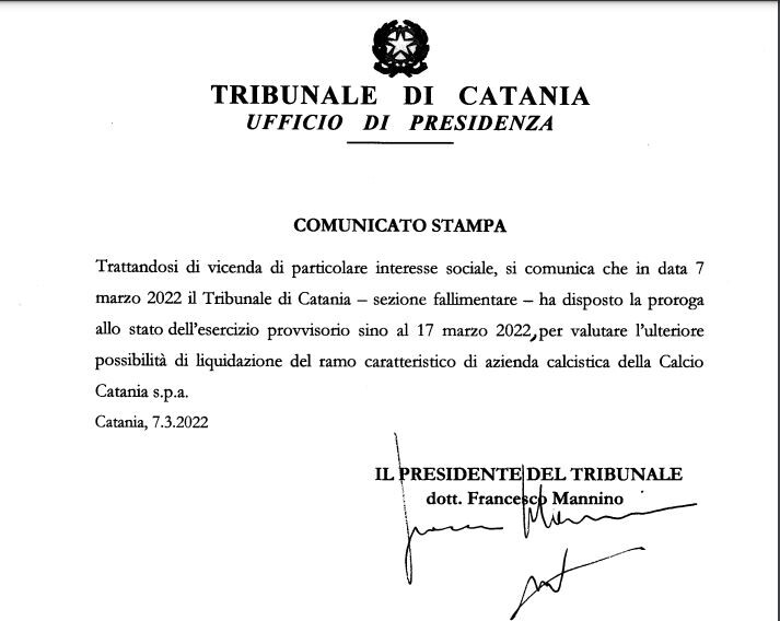 Da due mesi l'esercizio provvisorio viene di volta in volta prorogato in attesa che qualcuno possa acquisire il Catania. Vedremo se da qui a qualche ora verrà lanciato un nuovo bando o se saranno i curatori a occuparsi di una trattativa privata nella speranza che vada a buon fine.
