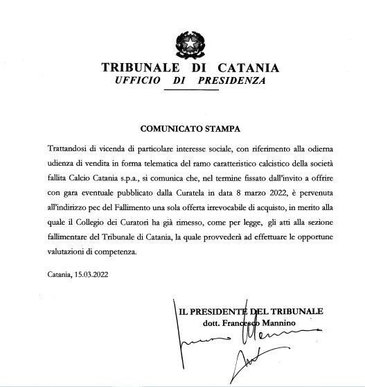 Il nuovo proprietario in pectore del Catania, Benedetto Mancini, nel pomeriggio si è diretto a Torre del Grifo, lasciando l'hotel del centro storico che lo ospita, dopo aver inviato al Tribunale la sua candidatura. Per l'esito positivo dell'asta competitiva alla quale aveva partecipato come unico pretendente, si attende la comunicazione ufficiale dello stesso tribunale che, in serata, ha diffuso un comunicato nel quale lo stesso presidente, dott. Francesco Mannino, ha specificato: “Trattandosi di vicenda di particolare interesse sociale, con riferimento alla odierna udienza di vendita in forma telematica del ramo caratteristico calcistico della società fallita Calcio Catania s.p.a., si comunica che, nel termine fissato dall’invito a offrire con gara eventuale pubblicato dalla Curatela in data 8 Marzo 2022, è pervenuta all’indirizzo pec del Fallimento una sola offerta irrevocabile di acquisto, in merito alla quale il Collegio dei Curatori ha già rimesso, come per legge, gli atti alla sezione fallimentare del Tribunale di Catania, la quale provvederà ad effettuare le opportune valutazioni di competenza”.