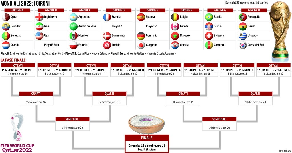 Questo il calendario delle partite della prima fase dei Mondiali di Qatar 2022: