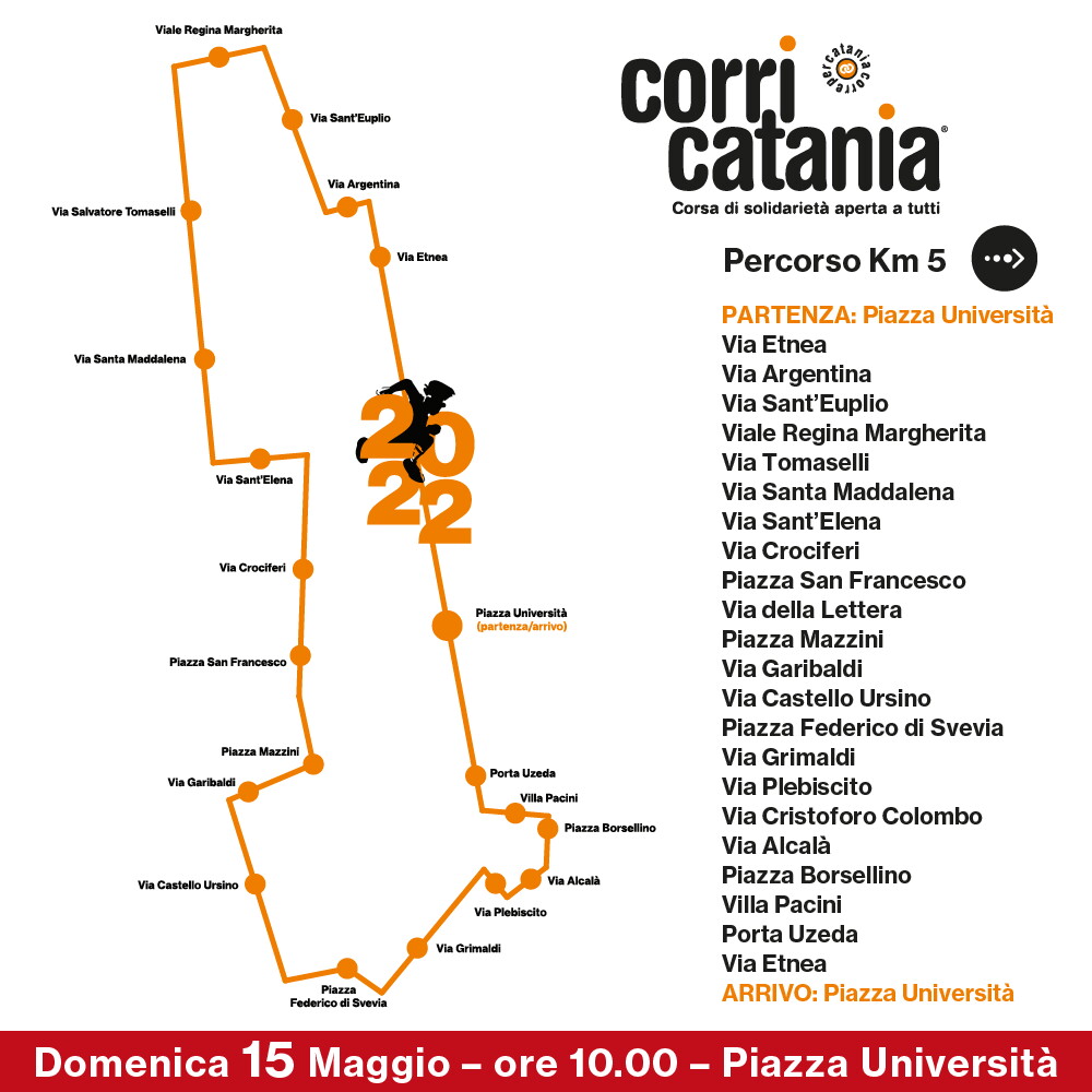 IL PERCORSO 2022. “Catania corre per Catania”, lo slogan della corsa-camminata domani si trasformerà in realtà e, partendo da piazza Università ci si muoverà, a passo libero, lungo via Etnea, via Argentina, via Sant’Euplio, viale Regina Margherita, via Tomaselli, via Santa Maddalena, via Sant’Elena, via Crociferi, piazza San Francesco, via della Lettera, piazza Mazzini, via Auteri, via Transito, via San Sebastiano, piazza Federico di Svevia, via Grimaldi, via Plebiscito, via Cristoforo Colombo, via Alcalà, piazza Borsellino, Villa Pacini, Porta Uzeda, piazza Duomo, via Etnea per far ritorno in piazza Università.